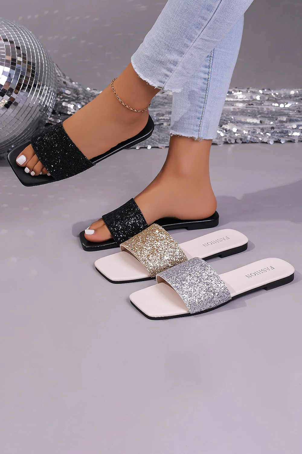 Casual Rhinestone Square Head Sequin Flat Slippers 2024 - Xpluswear