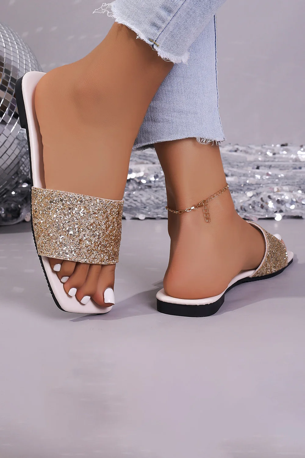 Casual Rhinestone Square Head Sequin Flat Slippers