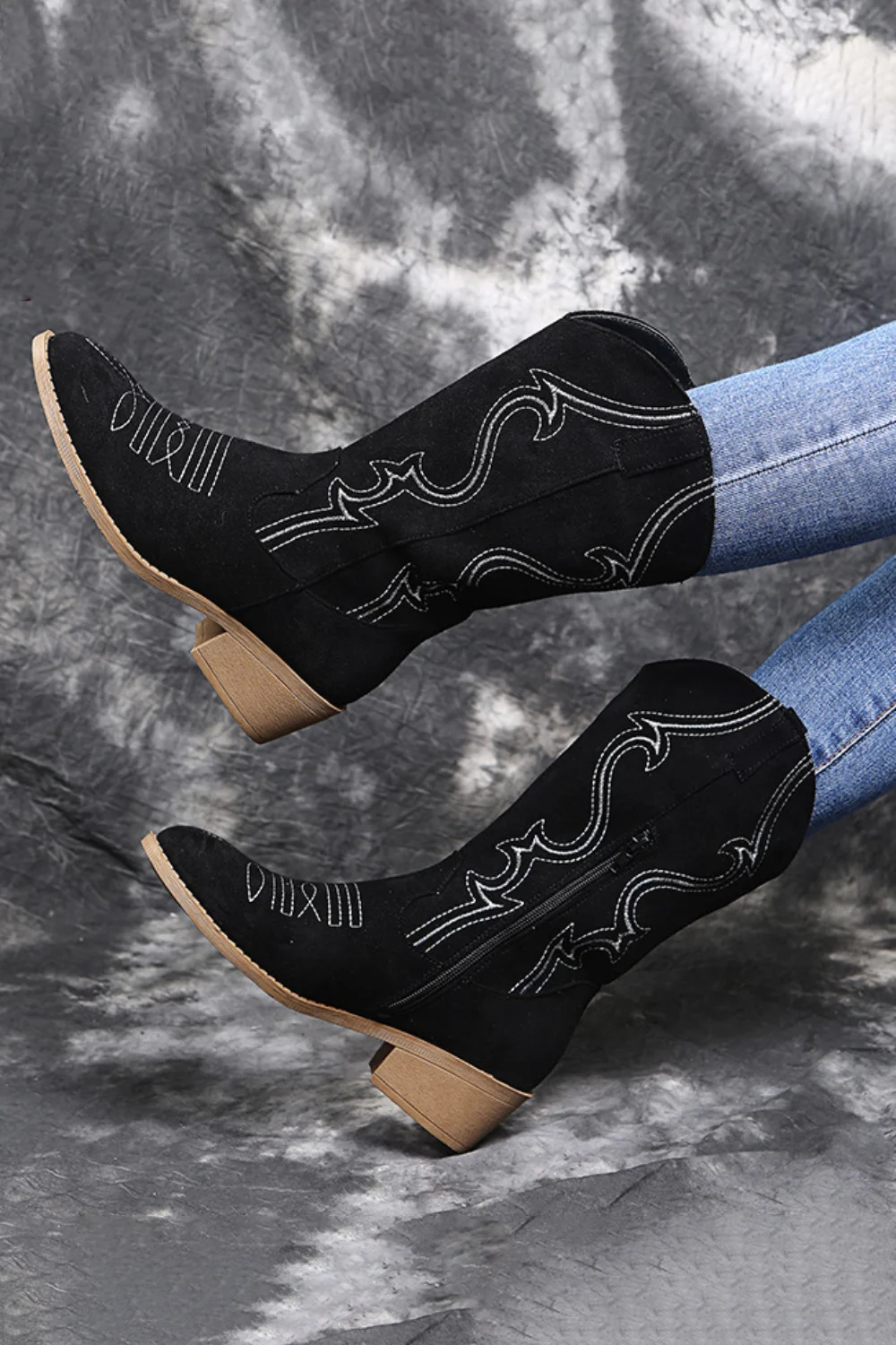 Daily Embroidered Pointy Toe Chunky Heel Cowboy Mid Calf Boots
