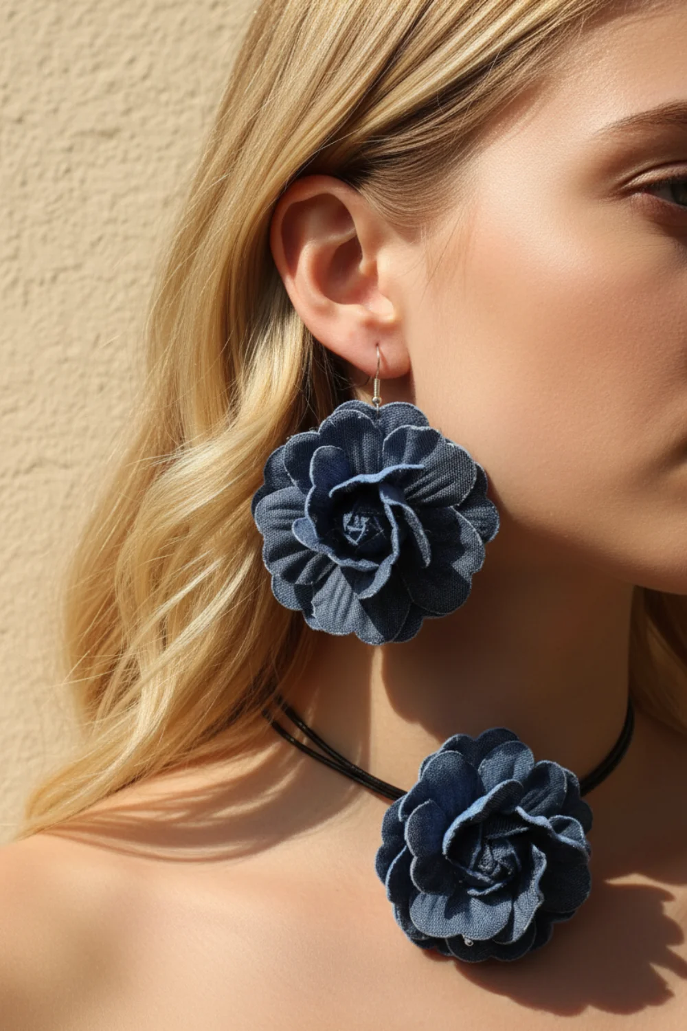 Fashion Blue Denim 3D Flower Earrings Necklace Jewelry Set 2024 - Xpluswear