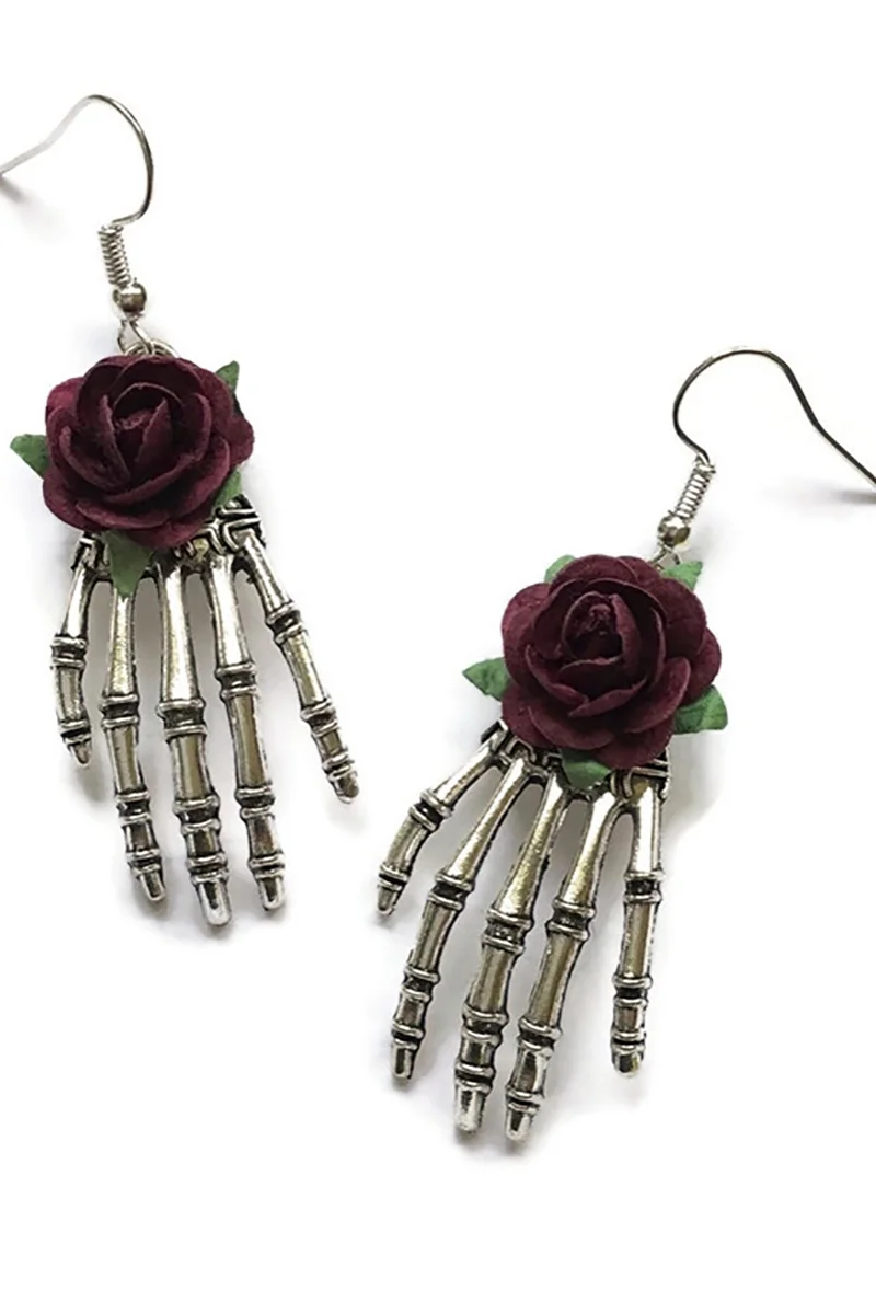 Halloween Gothic Skull Hand Red Rose Handmade Earrings