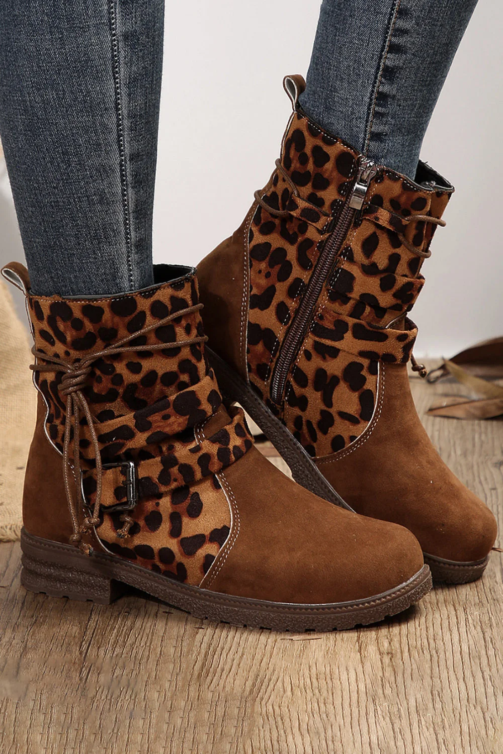 Leopard Print Lace Up Strap Buckle Patchwork Round Toe Boots 2024 - Xpluswear