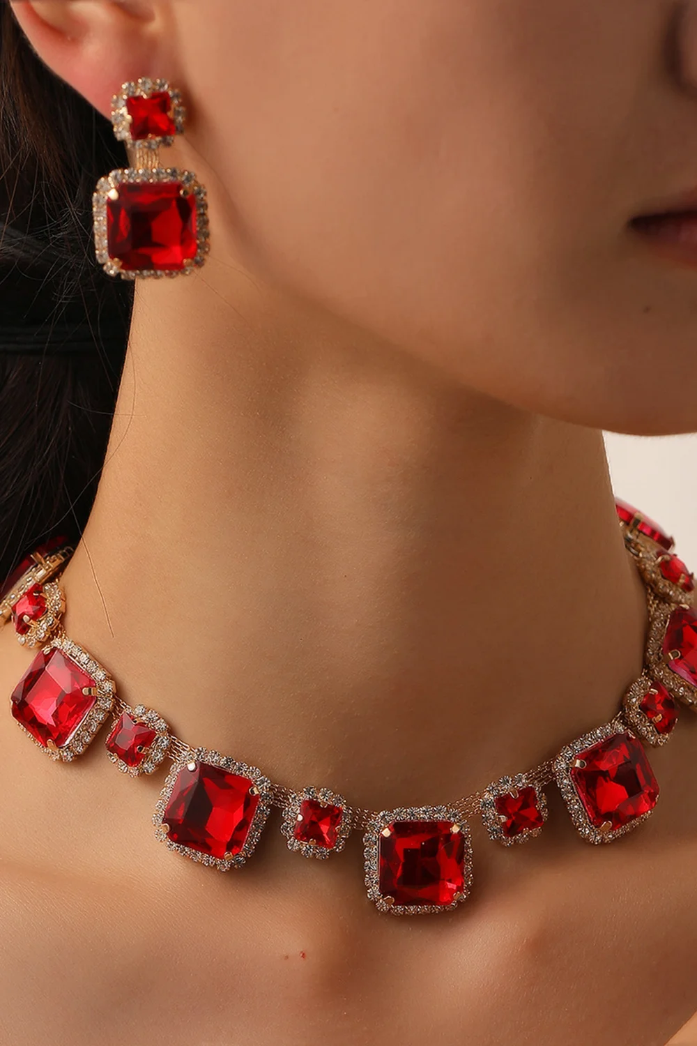 Party Exaggerated Rhinestone Square Shaped Earrings Necklace Jewelry Set 2024 - Xpluswear