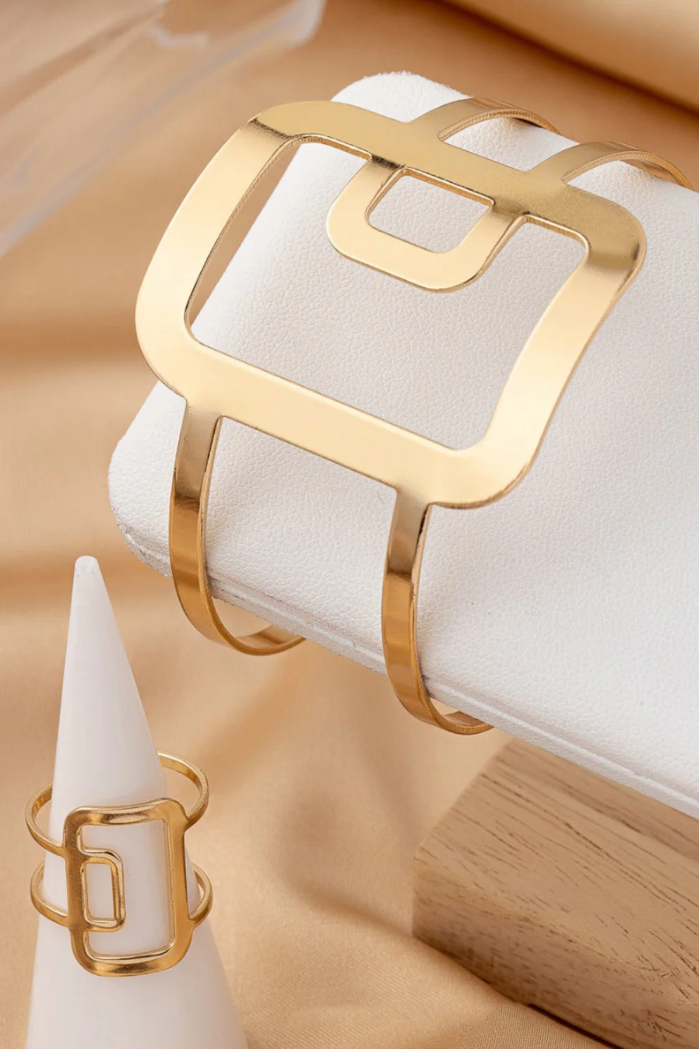 Party Geometric Square Hollow Splicing Textured Adjustable Open Bracelet Ring Jewelry Set