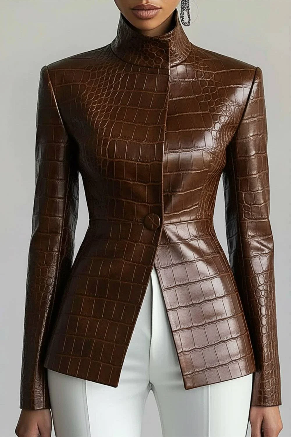 Plus Size Business Casual Black Crocodile Embossed Mock Neck Long Sleeve Casual PU Leather Jacket