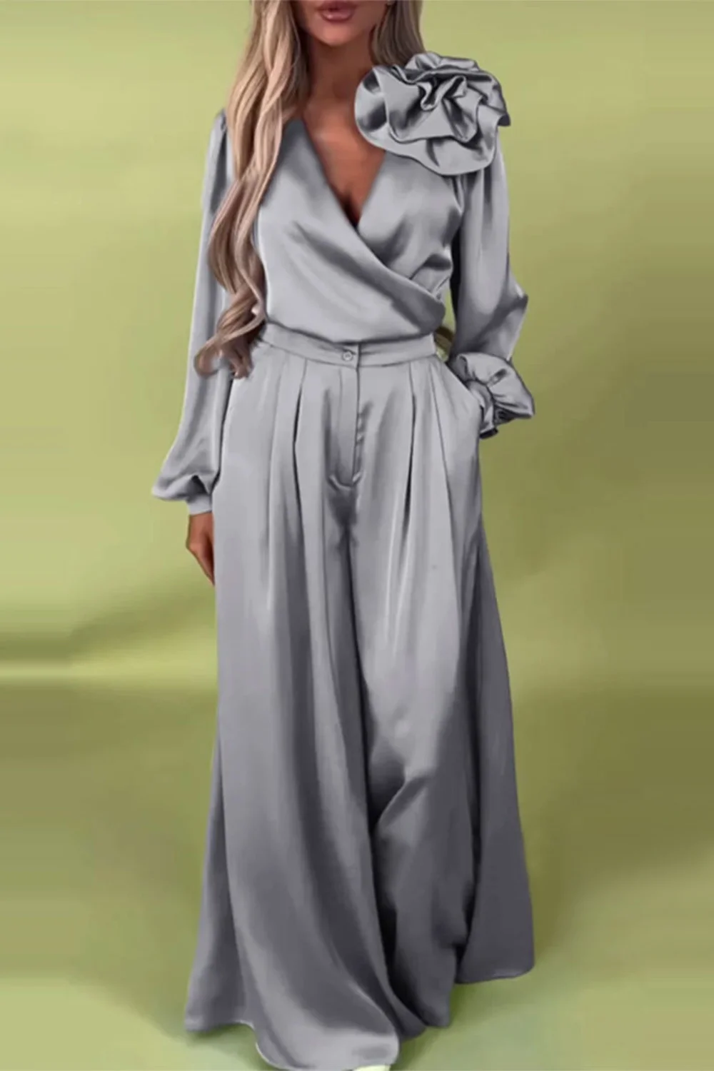 Plus Size Business Casual Blue Wrap Neck Lantern Sleeve Long Sleeve 3D Elegant Pocket Satin Two Piece Pant Sets