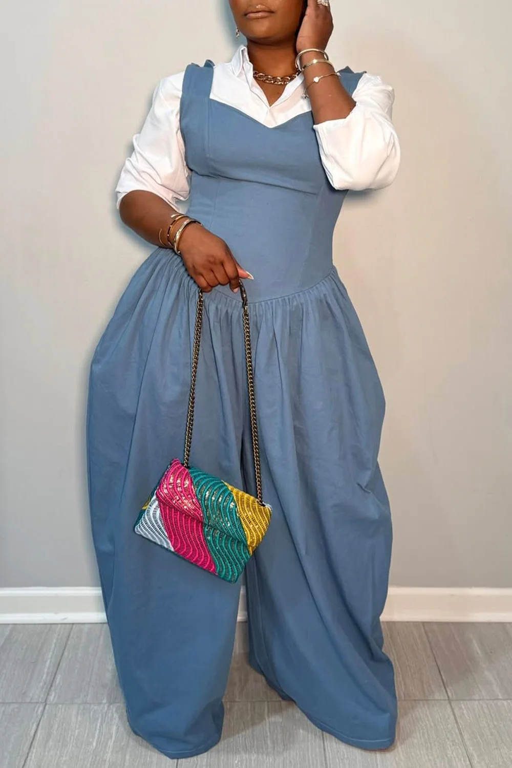 Plus Size Business Casual Casual Blue Square Neck Pocket Tencel Denim Jumpsuits (Without Blouse) [Pre-Order]