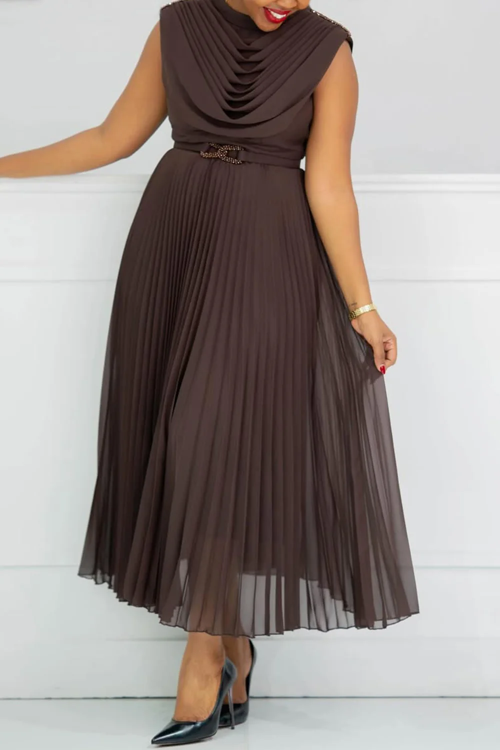 Plus Size Mother Of The Bride Elegant Brown Round Neck Pleated Fold Chiffon Midi Dresses (No Belt) [Pre-Order]