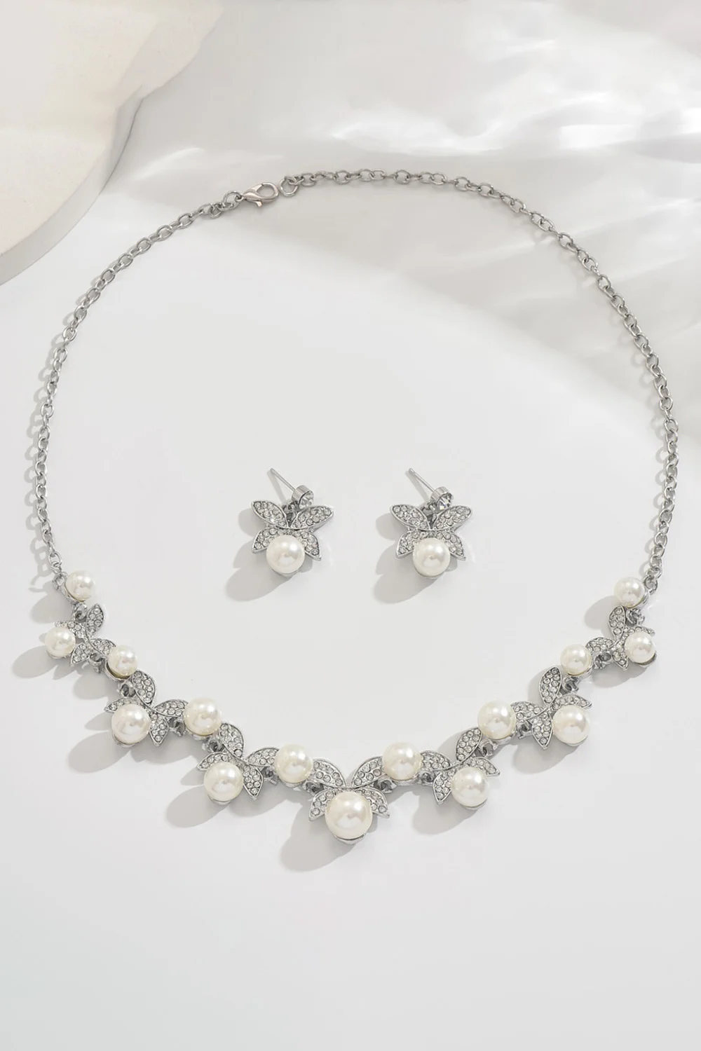 Wedding Rhinestone Butterfly Shaped Pearl Beads Earrings Necklace Jewelry Set