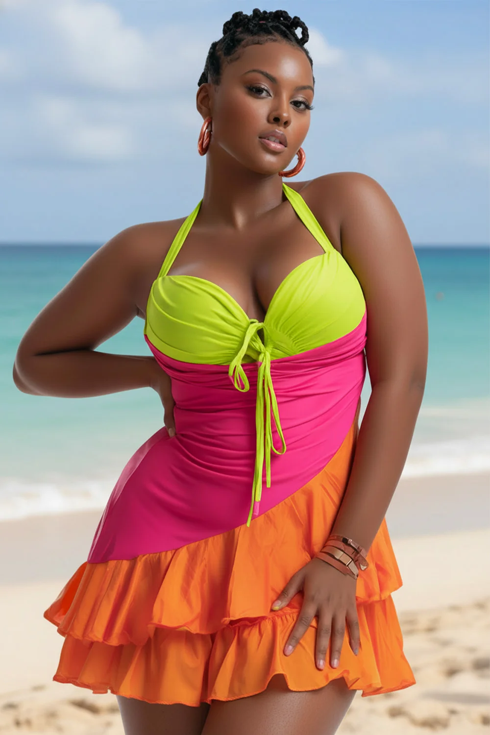 Xpluswear Design Plus Size Beach Multicolor Colorblock Halter Collar Ruffle Contrast Swimsuit Fabric Swimwear Dress [Pre-Order] 2024 - Xpluswear