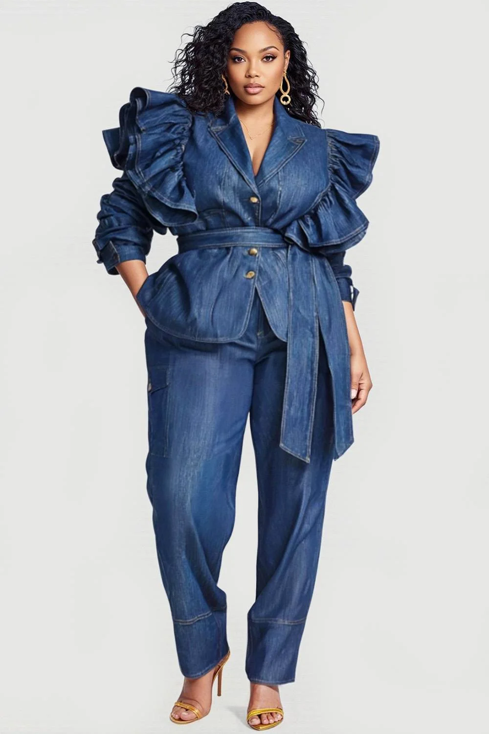 Xpluswear Design Plus Size Business Casual Blue Turndown Collar Long Sleeve Ruffle Elegant Pocket Two Piece Pant Sets 2024 - Xpluswear