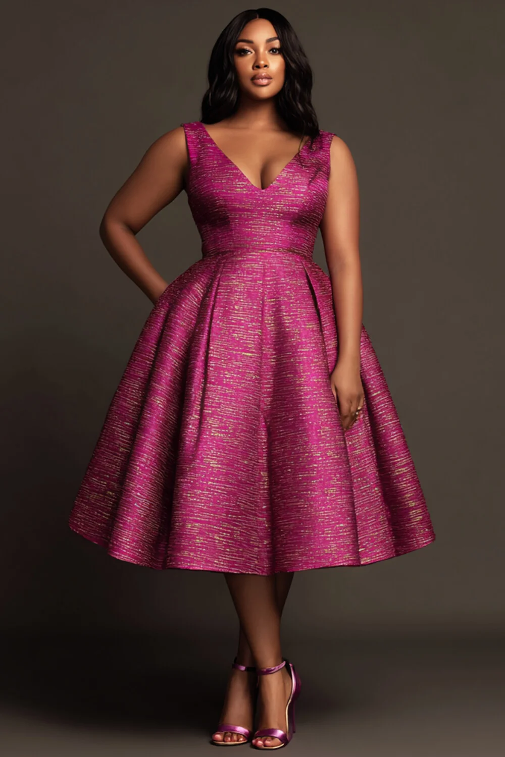 Xpluswear Design Plus Size Cocktail Party Elegant Hot Pink V Neck Pocket Pleated Satin Midi Dresses [Pre-Order] 2024 - Xpluswear