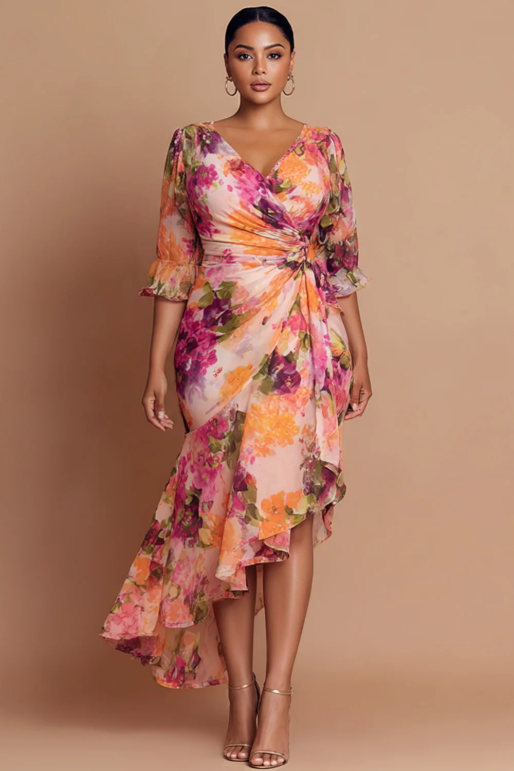 Xpluswear Design Plus Size Cocktail Party Elegant Multicolor Floral Wrap Neck Half Sleeve Ruffle Asymmetric Hem Chiffon Midi Dresses [Pre-Order] 2024 - Xpluswear