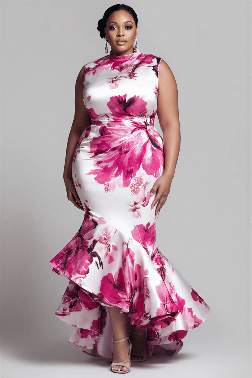 Xpluswear Design Plus Size Cocktail Party Elegant Pink Floral Round Neck Short Sleeve Mermaid Asymmetric Hem Irregular Hem Satin Midi Dresses [Pre-Order] 2024 - Xpluswear