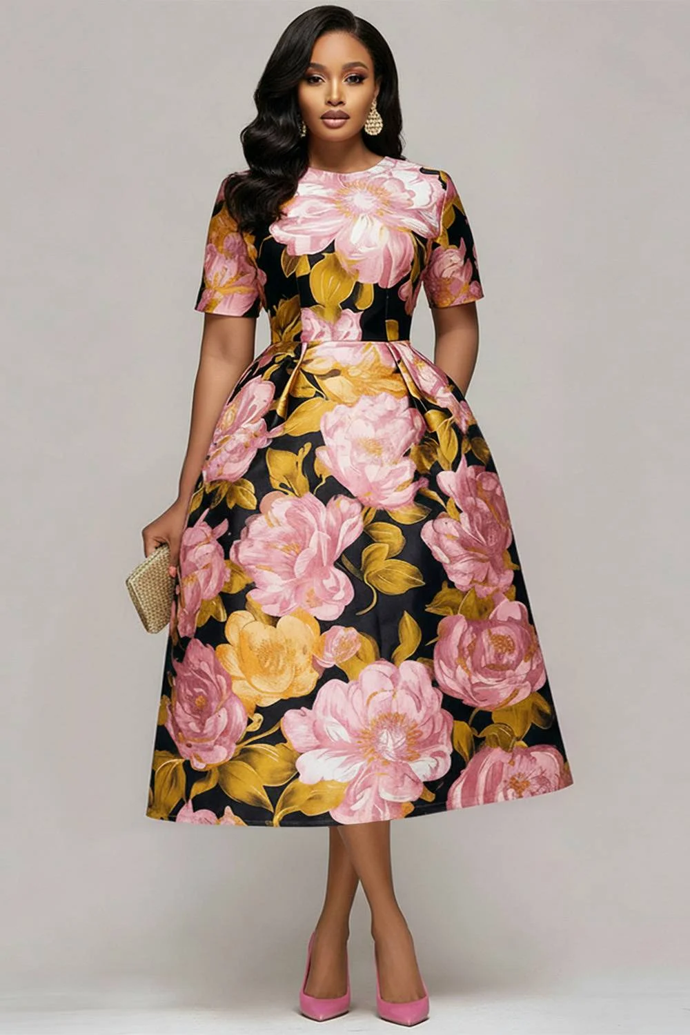 Xpluswear Design Plus Size Cocktail Party Pink Floral Round Neck Short Sleeve Pocket Satin Midi Dresses [Pre-Order] 2024 - Xpluswear