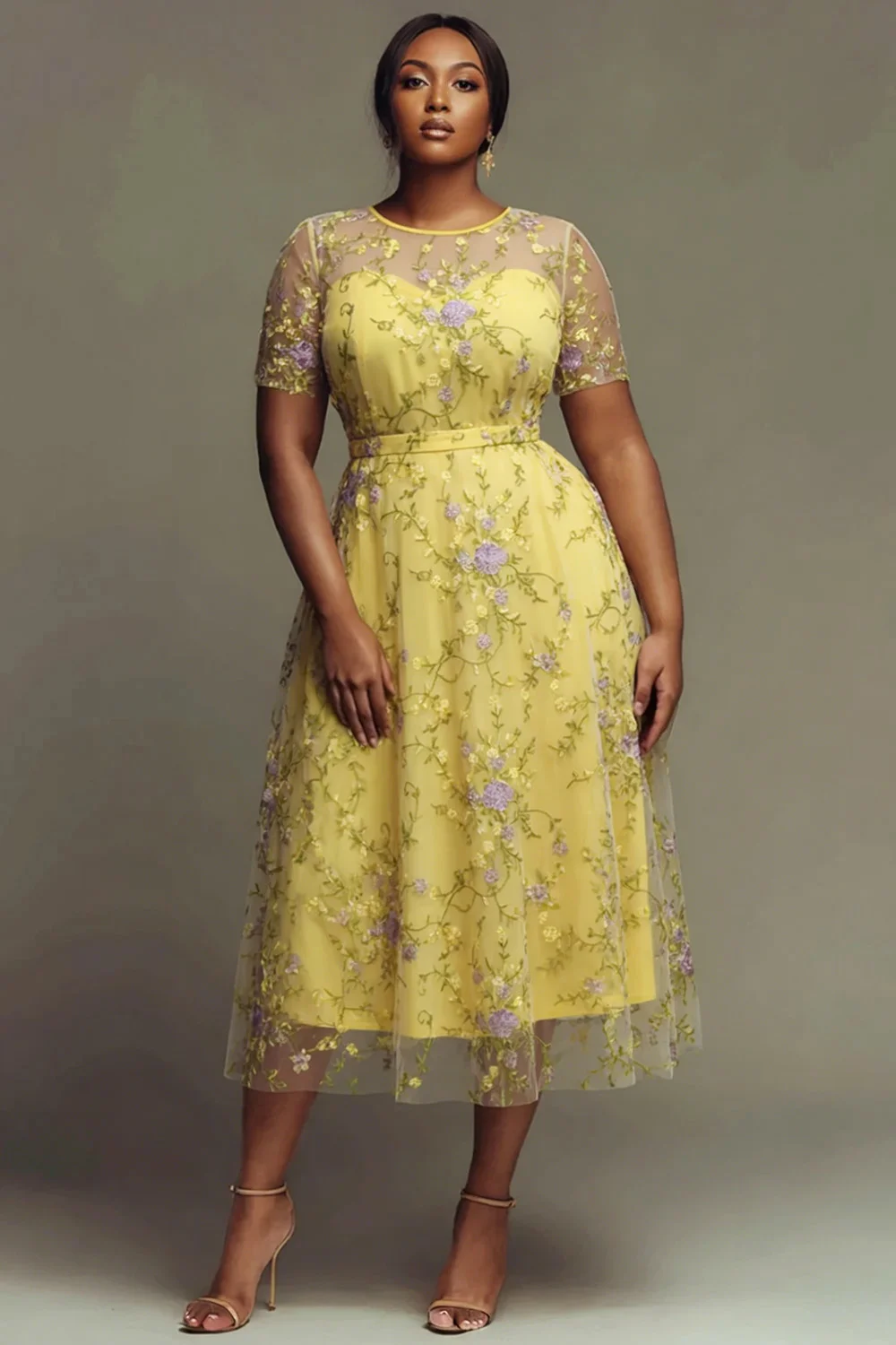 Xpluswear Design Plus Size Cocktail Party Yellow Floral Round Neck Short Sleeve Embroidery See Through Midi Dresses [Pre-Order] 2024 - Xpluswear