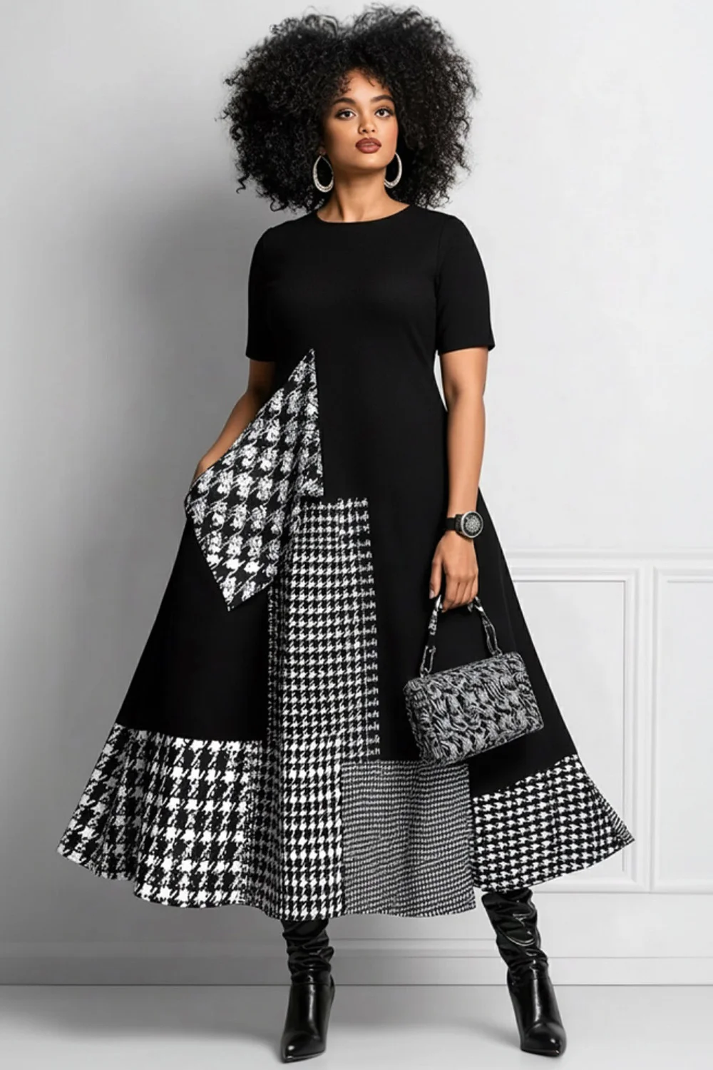 Xpluswear Design Plus Size Daily Black Houndstooth Round Neck Short Sleeve Pocket Elegant Maxi Dresses 2024 - Xpluswear