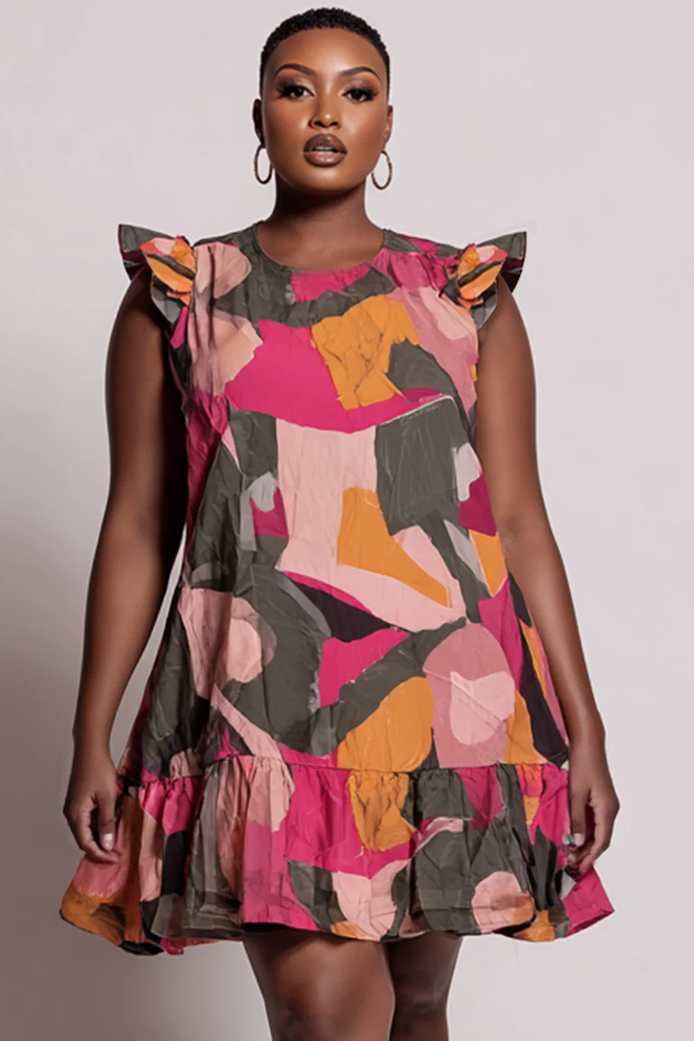 Xpluswear Design Plus Size Daily Casual Multicolor Graphic Round Neck Flutter Sleeve Ruffle Mini Dresses [Pre-Order]