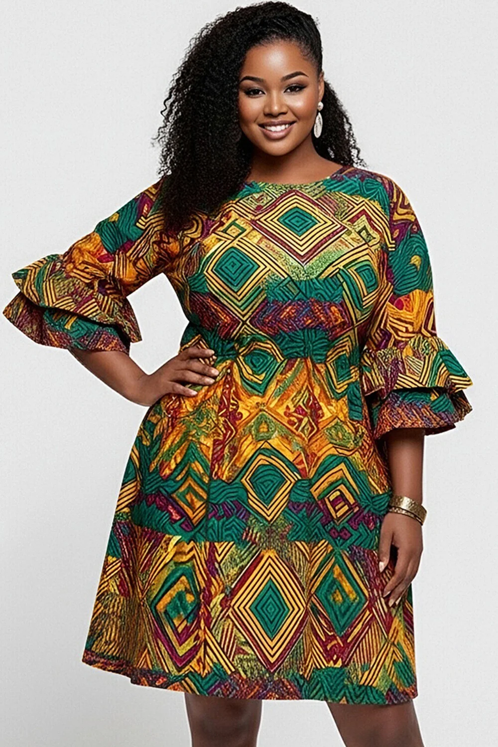 Xpluswear Design Plus Size Daily Multicolor African Print Round Neck Flare Short Sleeve Ruffle Mini Dresses [Pre-Order] 2024 - Xpluswear