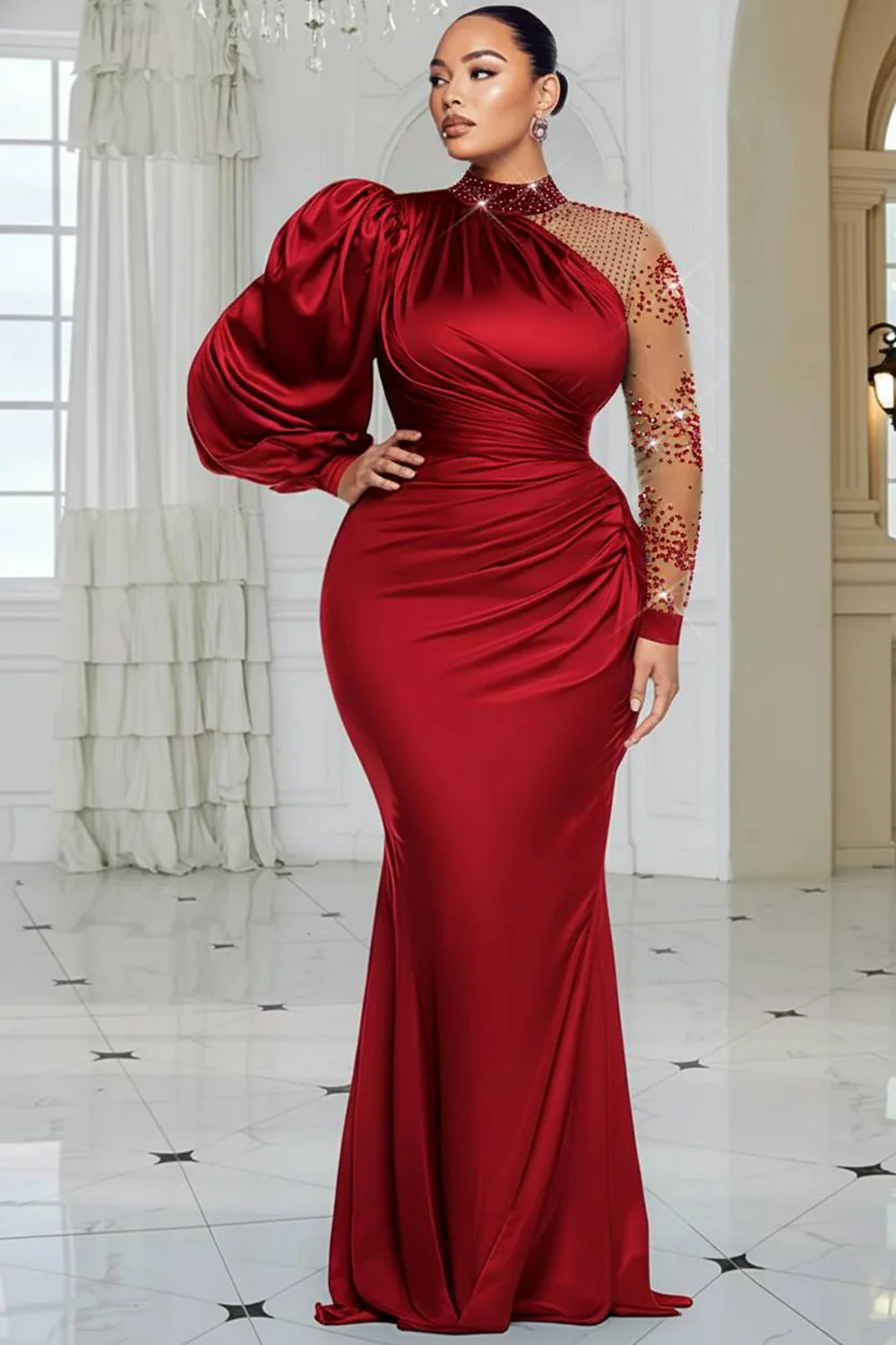 Xpluswear Design Plus Size Formal Blue Mock Neck Lantern Sleeve Long Sleeve Drilling Elegant See Through Tulle Satin Maxi Dresses 2024 - Xpluswear