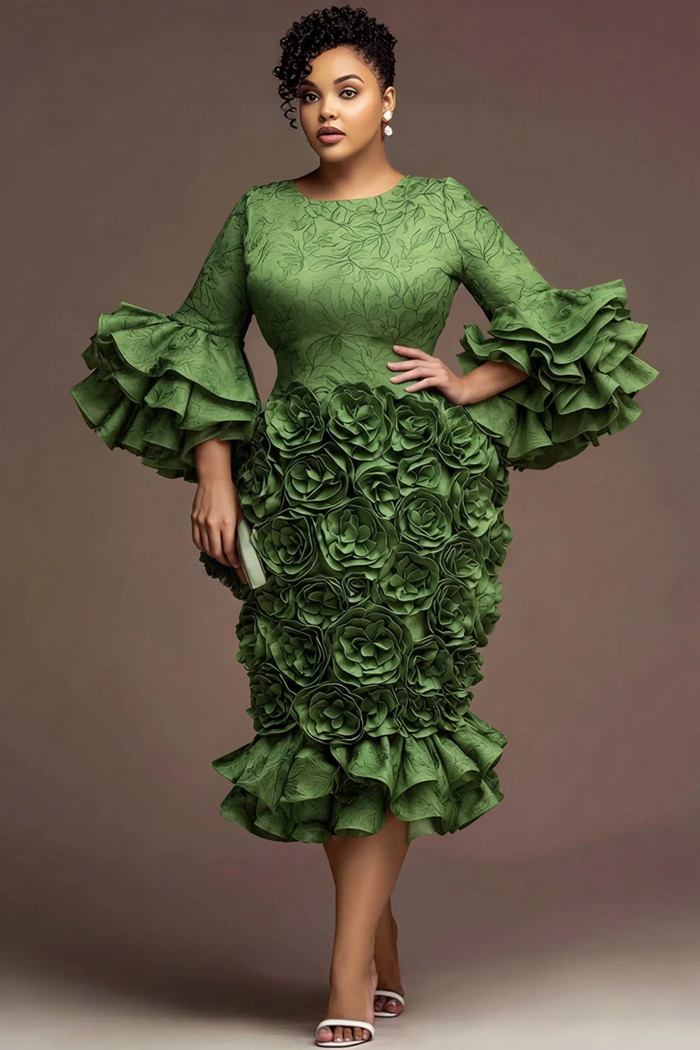 Xpluswear Design Plus Size Formal Green Round Neck Flare 3/4 Sleeve 3D Ruffle Satin Midi Dresses [Pre-Order]