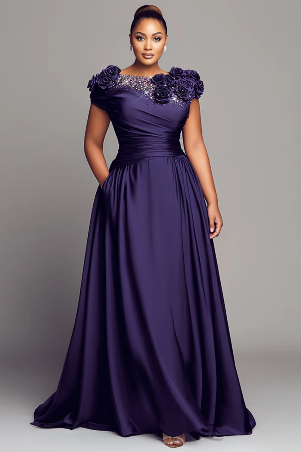 Xpluswear Design Plus Size Formal Pink Boat Neck Cap Sleeve Short Sleeve 3D Drilling Satin Maxi Dresses [Pre-Order] 2024 - Xpluswear
