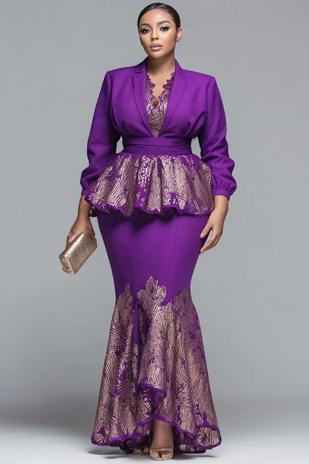 Xpluswear Design Plus Size Formal Purple African Print Lapel Collar Long Sleeve Mermaid Two Piece Skirt Sets [Pre-Order] 2024 - Xpluswear