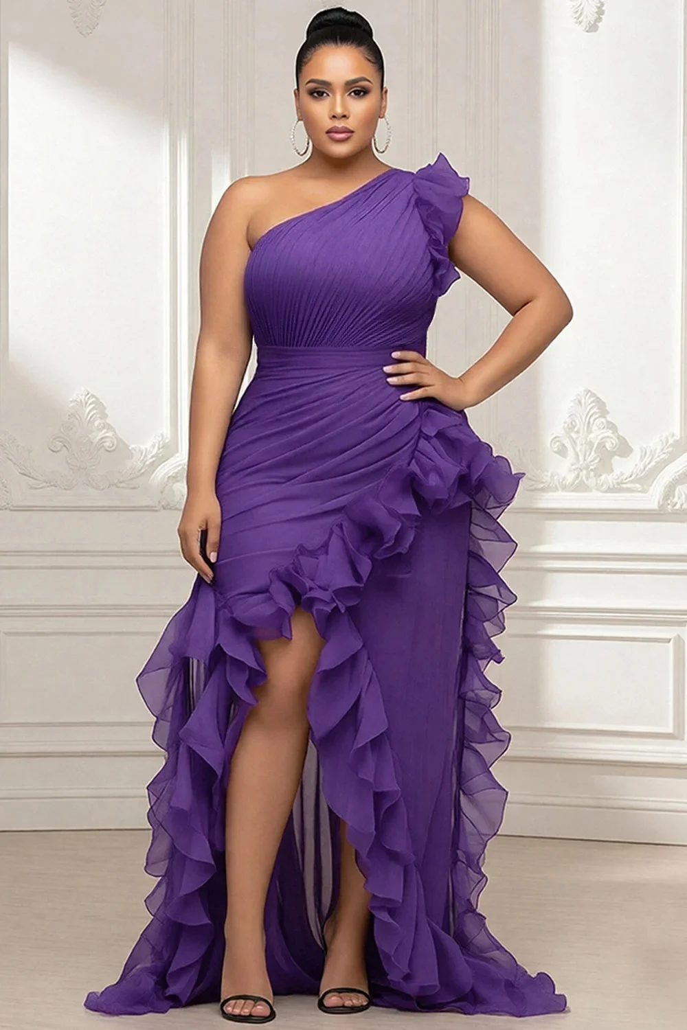 Xpluswear Design Plus Size Formal Purple Oblique Collar One Shoulder Ruffle Split Chiffon Maxi Dresses [Pre-Order] 2024 - Xpluswear
