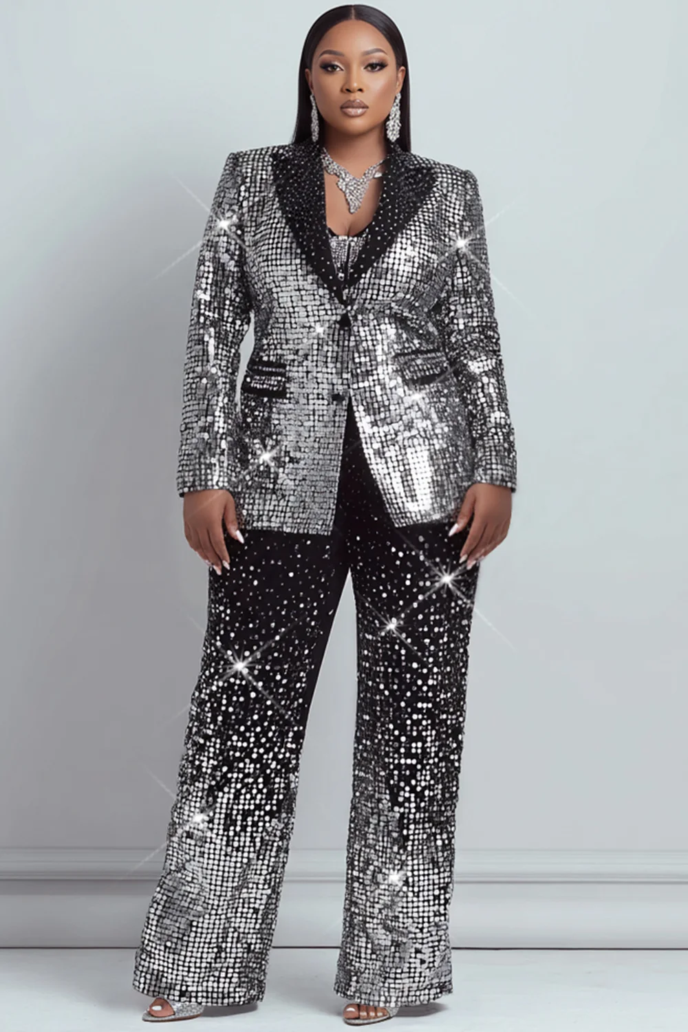Xpluswear Design Plus Size Formal Silver Graphic Lapel Collar Long Sleeve Pocket Two Piece Pant Suits [Pre-Order] 2024 - Xpluswear
