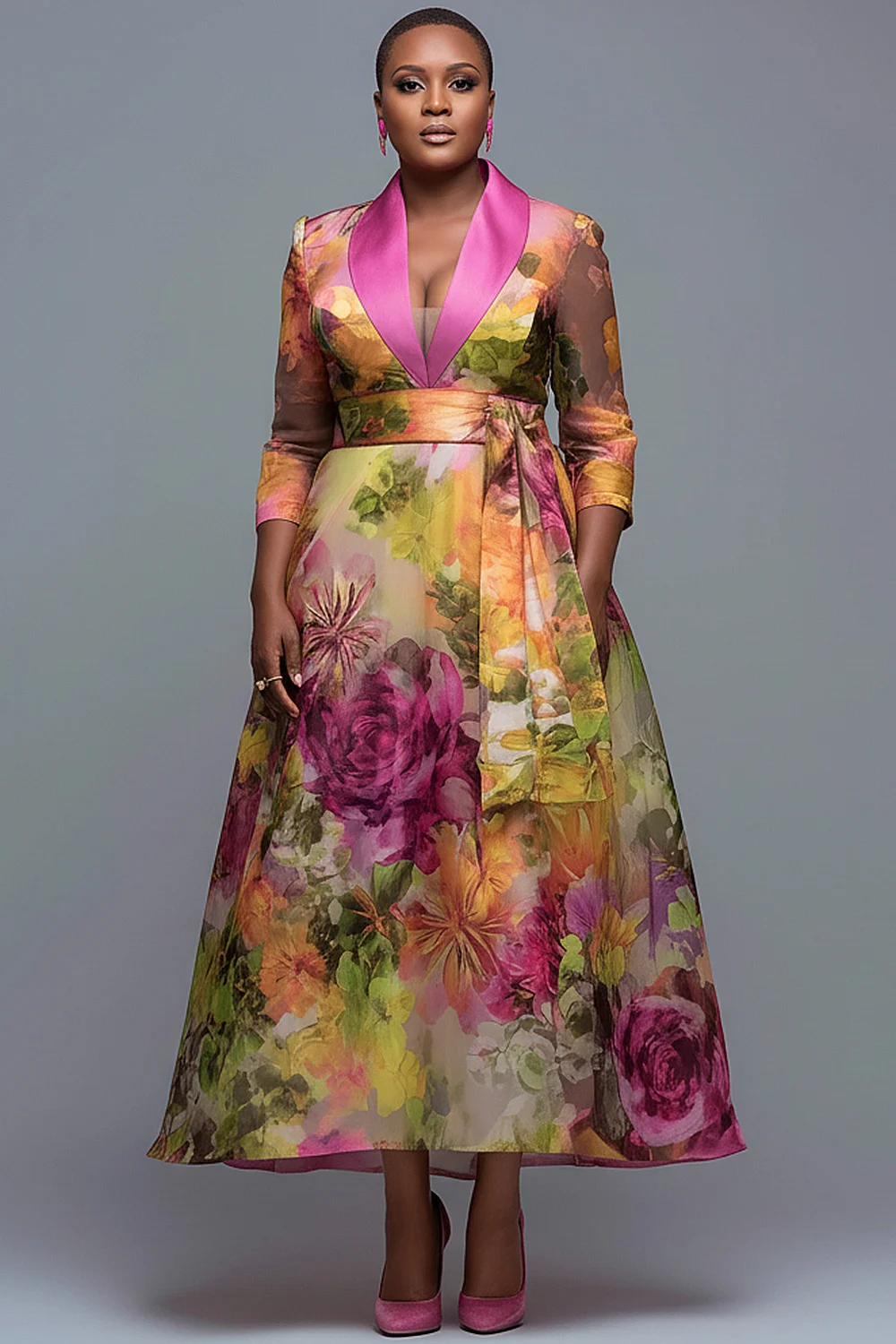 Xpluswear Design Plus Size Mother Of The Bride Multicolor Floral Turndown Collar 3/4 Sleeve Contrast Organza Maxi Dresses [Pre-Order] 2024 - Xpluswear