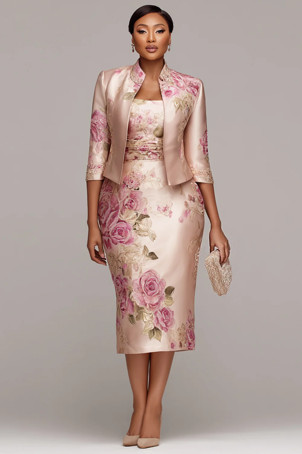 Xpluswear Design Plus Size Mother Of The Bride Pink Floral Half Sleeve Bodycon Satin Two Piece Dress Set [Pre-Order]