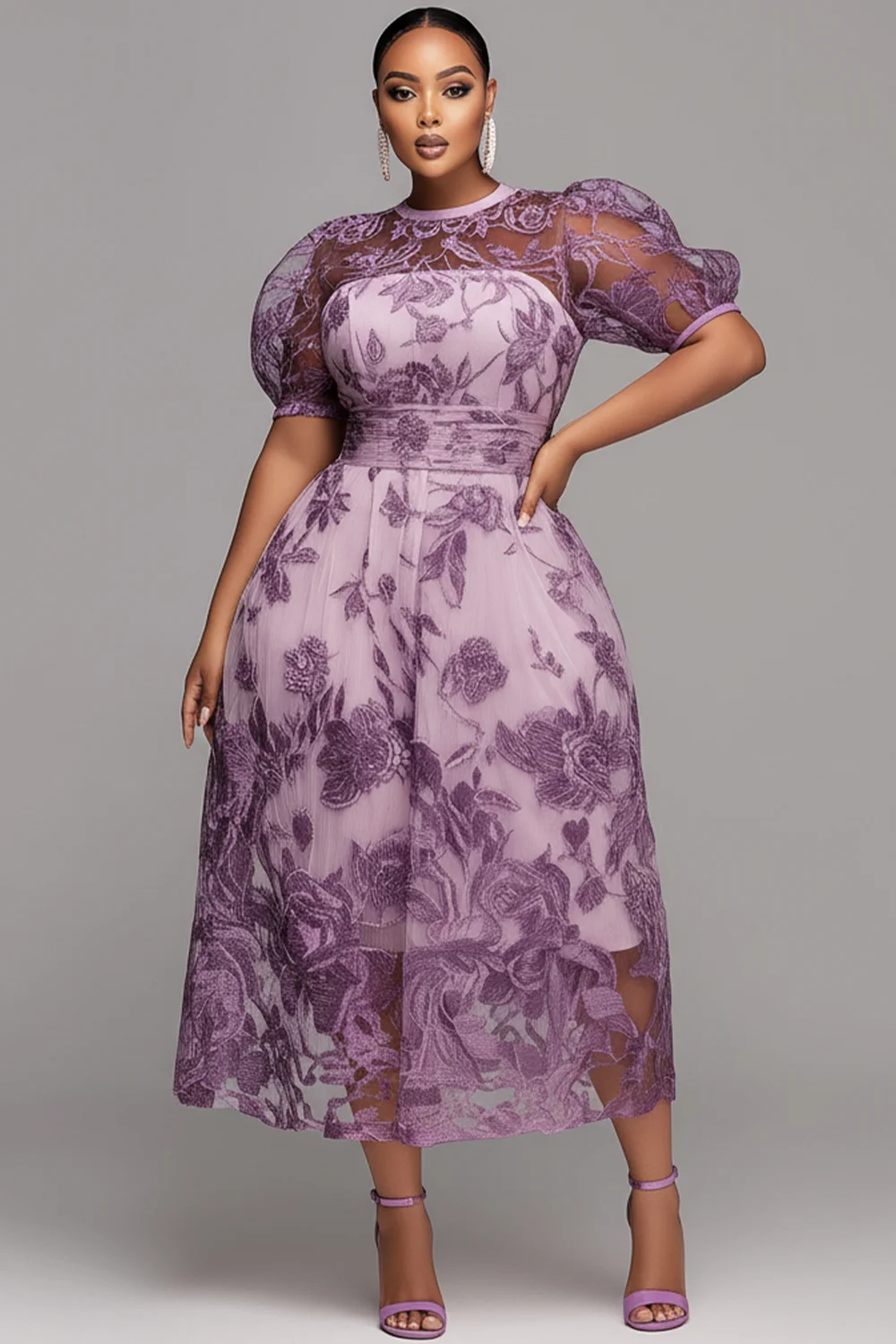 Xpluswear Design Plus Size Mother Of The Bride Purple Round Neck Puff Sleeve Short Sleeve See Through Lace Midi Dresses [Pre-Order]