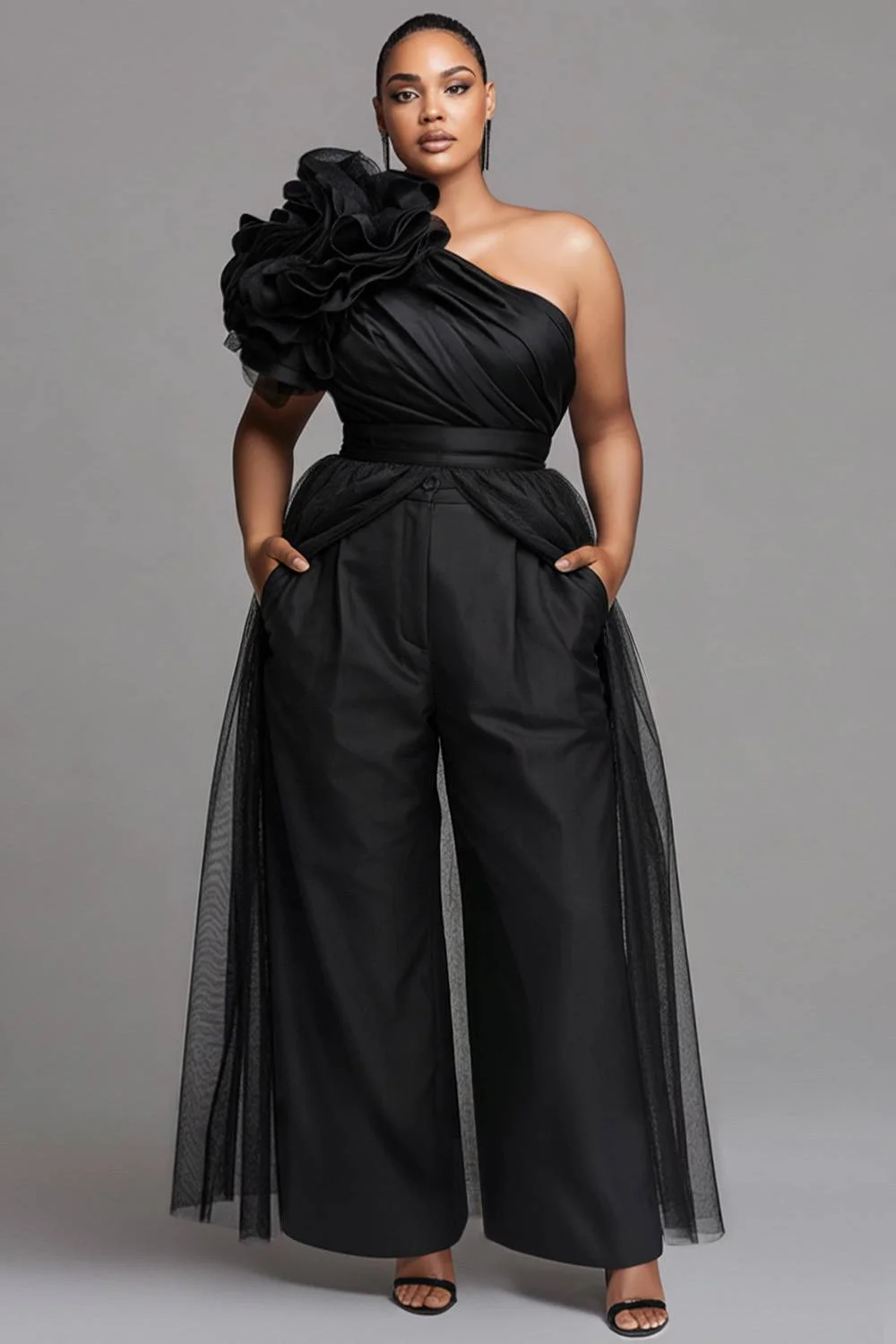 Xpluswear Design Plus Size Party Black 3D With Skirt Overlay Tulle Jumpsuits [Pre-Order] 2024 - Xpluswear
