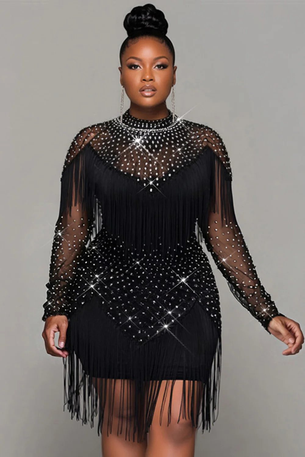 Xpluswear Design Plus Size Party Black Round Neck Long Sleeve Drilling Strappy Tulle Mini Dresses [Pre-Order]