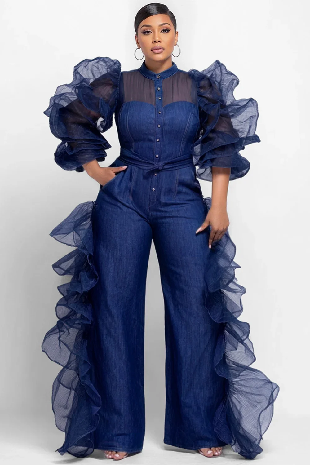Xpluswear Design Plus Size Party Blue Round Neck Puff Sleeve 3/4 Sleeve Ruffle See Through Organza Tencel Denim Jumpsuits