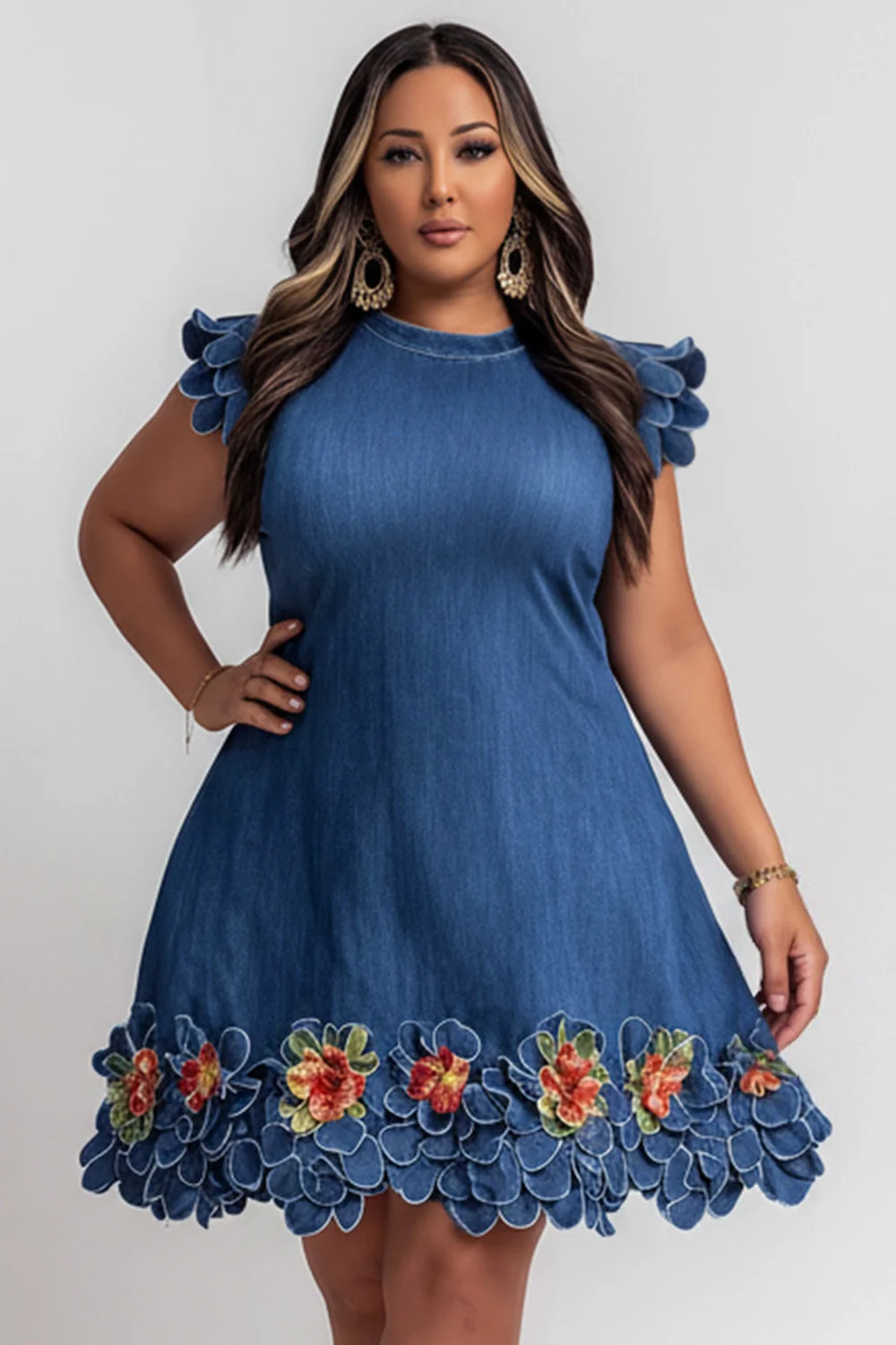 Xpluswear Design Plus Size Party Blue Round Neck Short Sleeve 3D Pocket Tencel Denim Mini Dresses [Pre-Order]