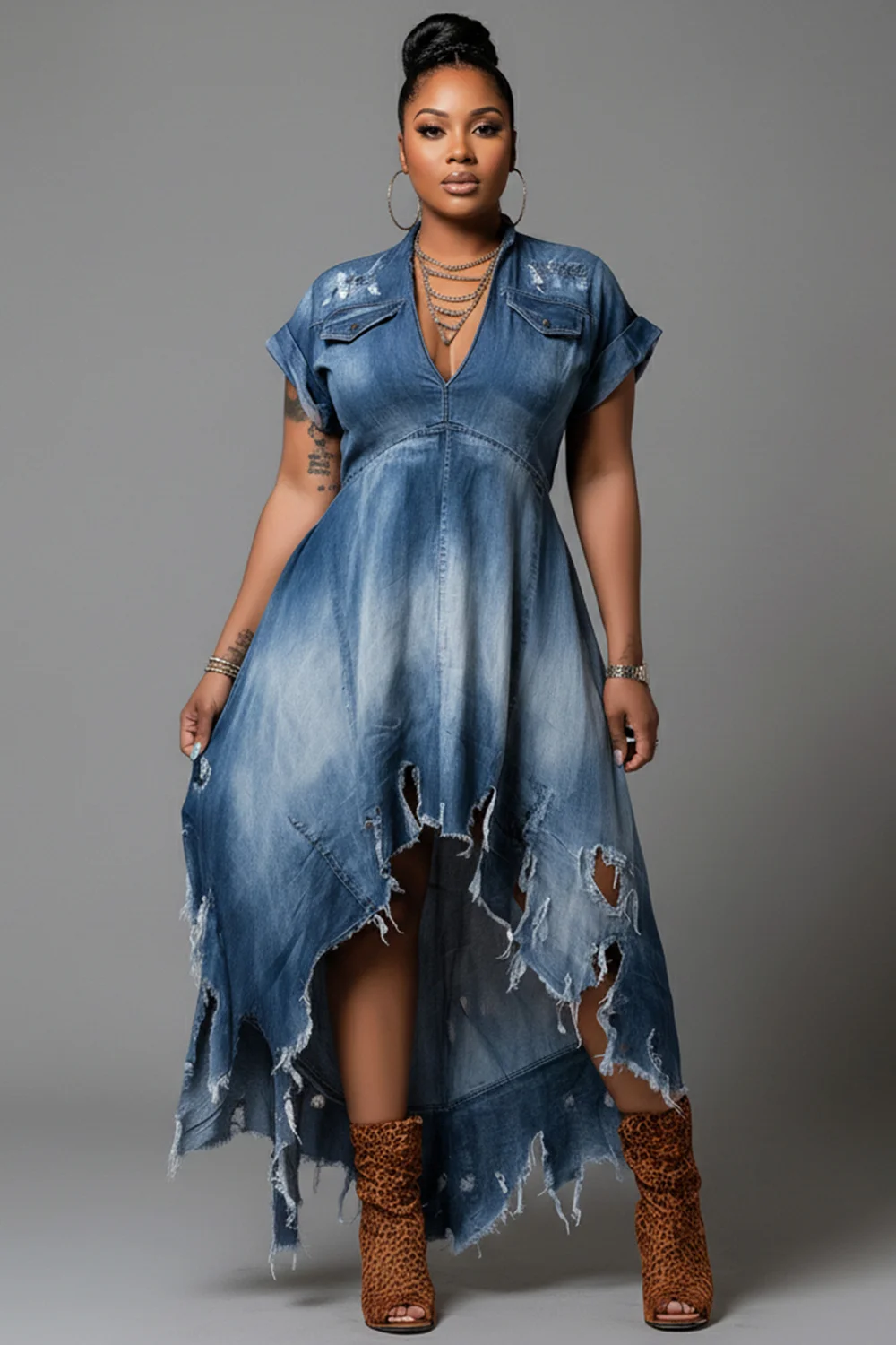 Xpluswear Design Plus Size Party Blue V Neck Short Sleeve Ripped Asymmetric Hem Denim Midi Dresses [Pre-Order] 2024 - Xpluswear