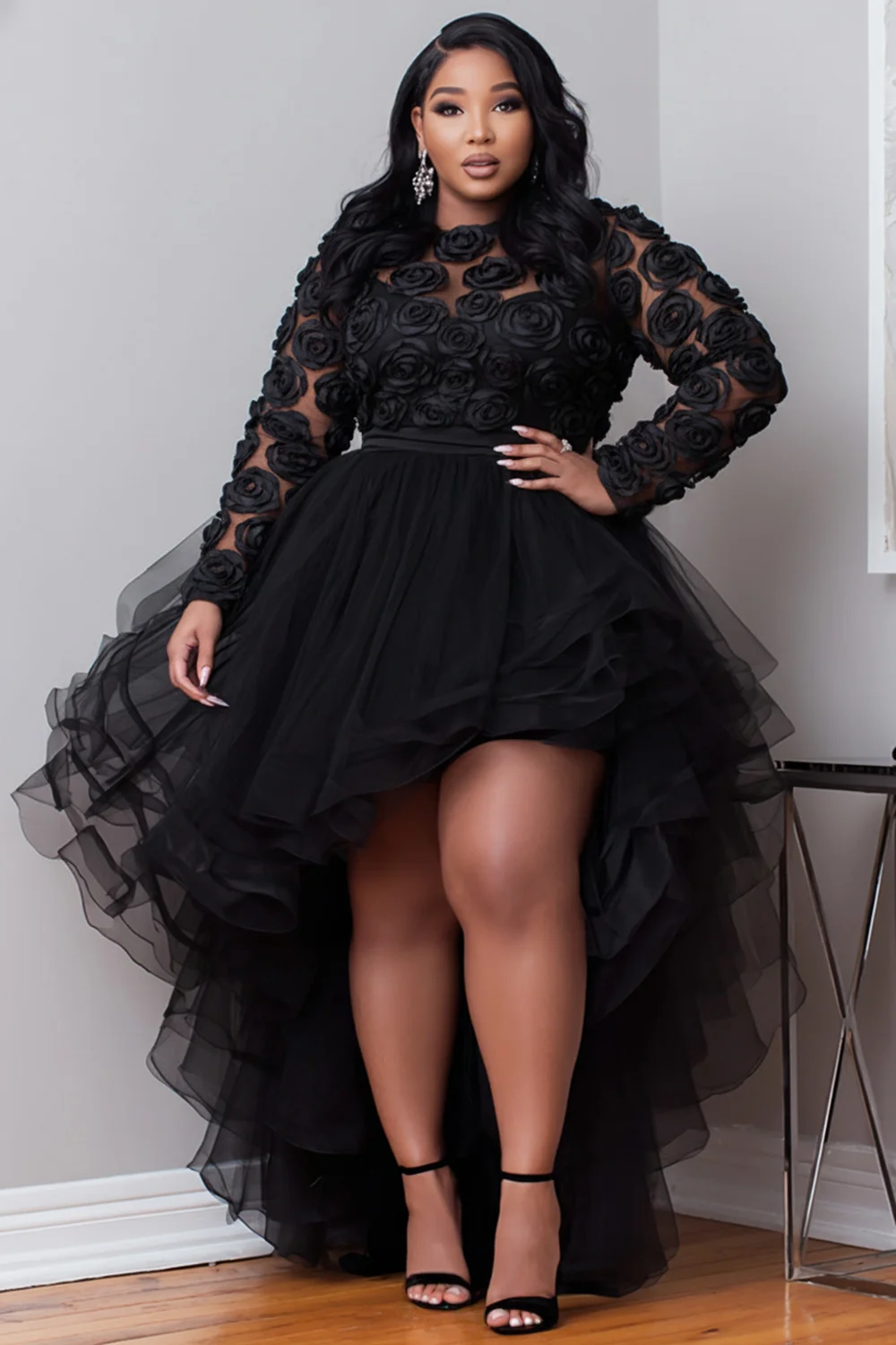 Xpluswear Design Plus Size Party Gold Round Neck Long Sleeve 3D Elegant High Low Hem Tulle Mini Dresses