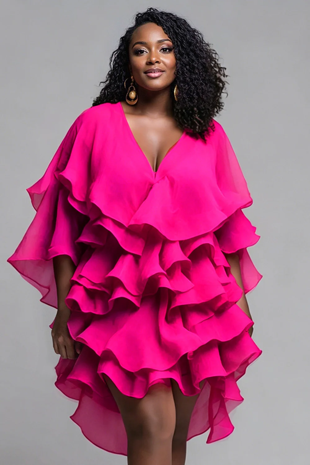 Xpluswear Design Plus Size Party Hot Pink V Neck Half Sleeve Ruffle Tiered Mini Dresses [Pre-Order] 2024 - Xpluswear