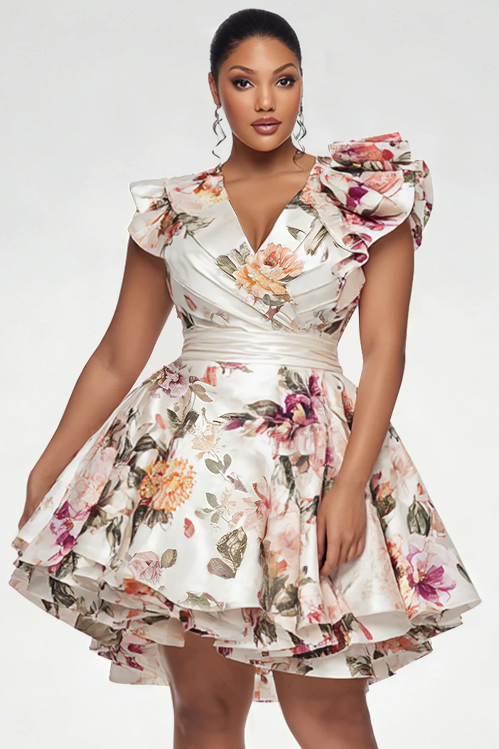 Xpluswear Design Plus Size Party Multicolor Floral Wrap Neck Short Sleeve Ruffle Satin Mini Dresses [Pre-Order] 2024 - Xpluswear