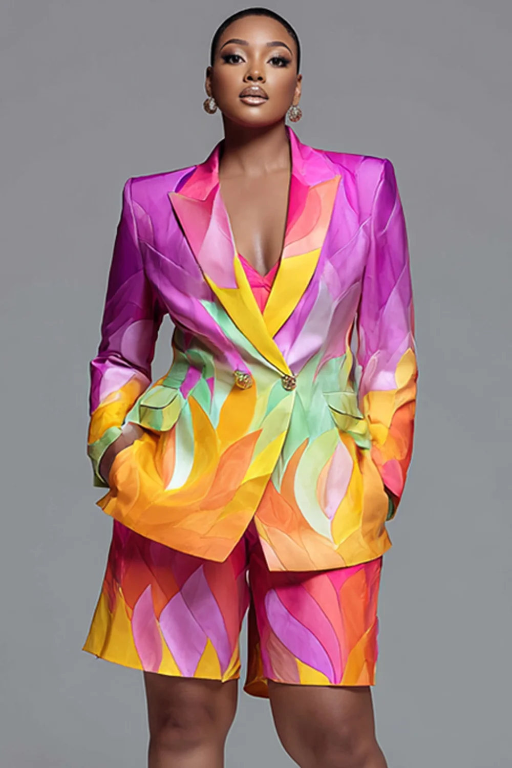 Xpluswear Design Plus Size Party Multicolor Graphic Lapel Collar Long Sleeve Pocket Satin Two Piece Short Suits [Pre-Order]