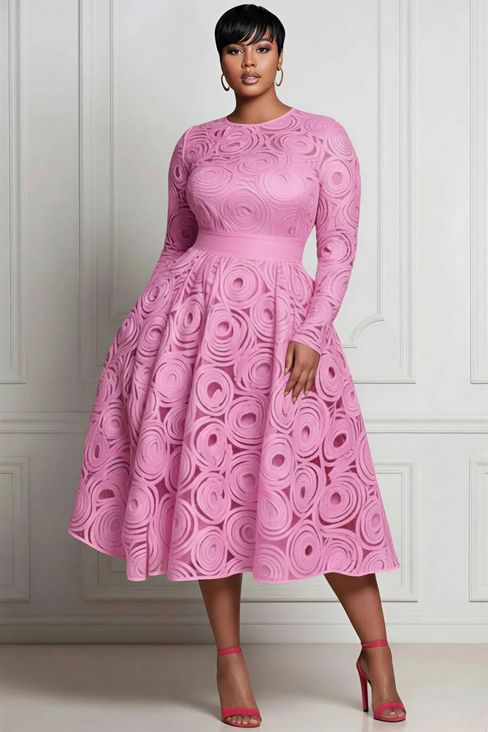 Xpluswear Design Plus Size Pink All Over Print Round Neck Long Sleeve Pocket Elegant Satin Midi Dresses 2024 - Xpluswear