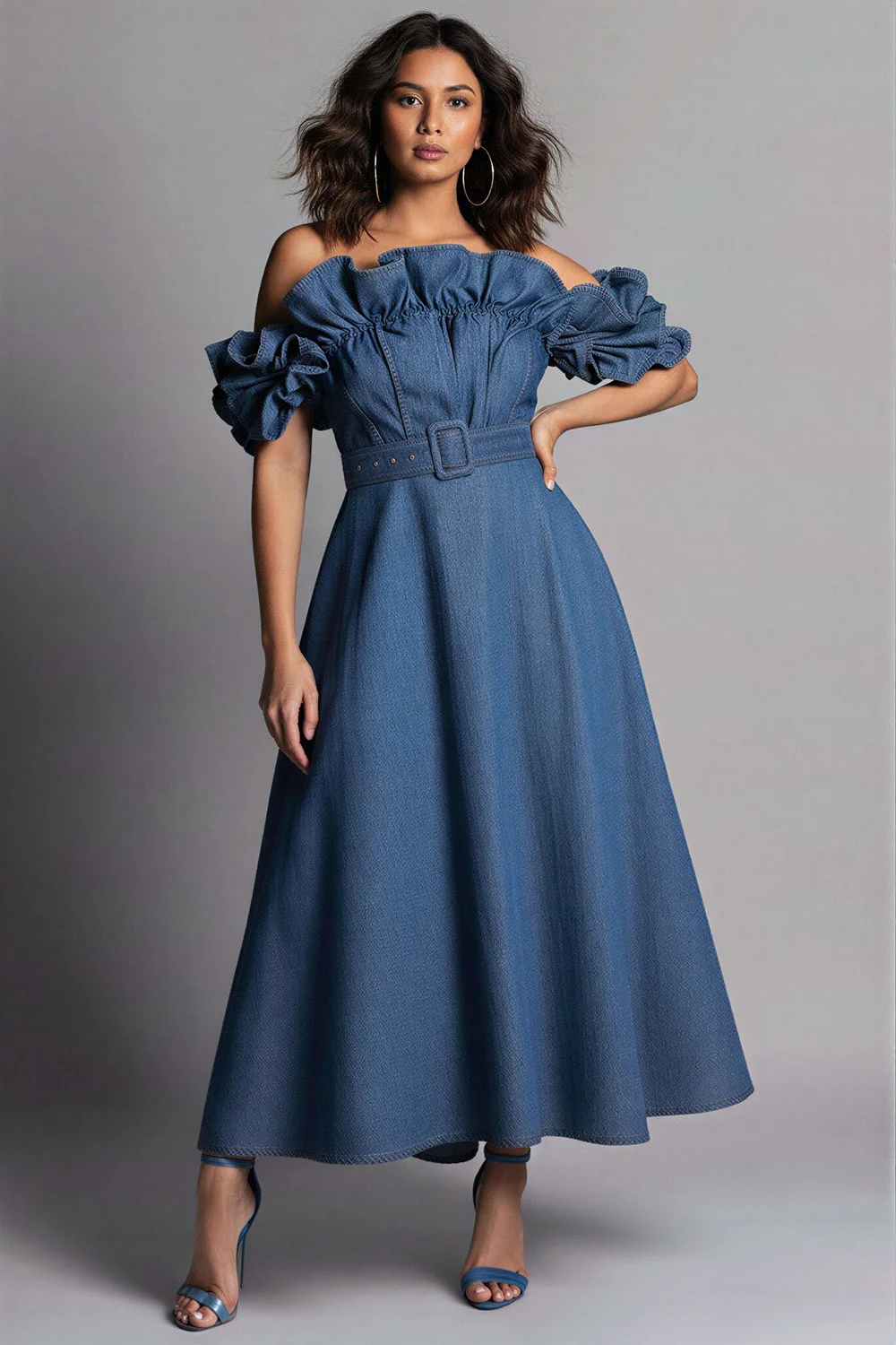 Xpluswear Design Plus Size Vacation Casual Blue Off The Shoulder Short Sleeve Ruffle Pocket Tencel Denim Midi Dresses [Pre-Order] 2024 - Xpluswear
