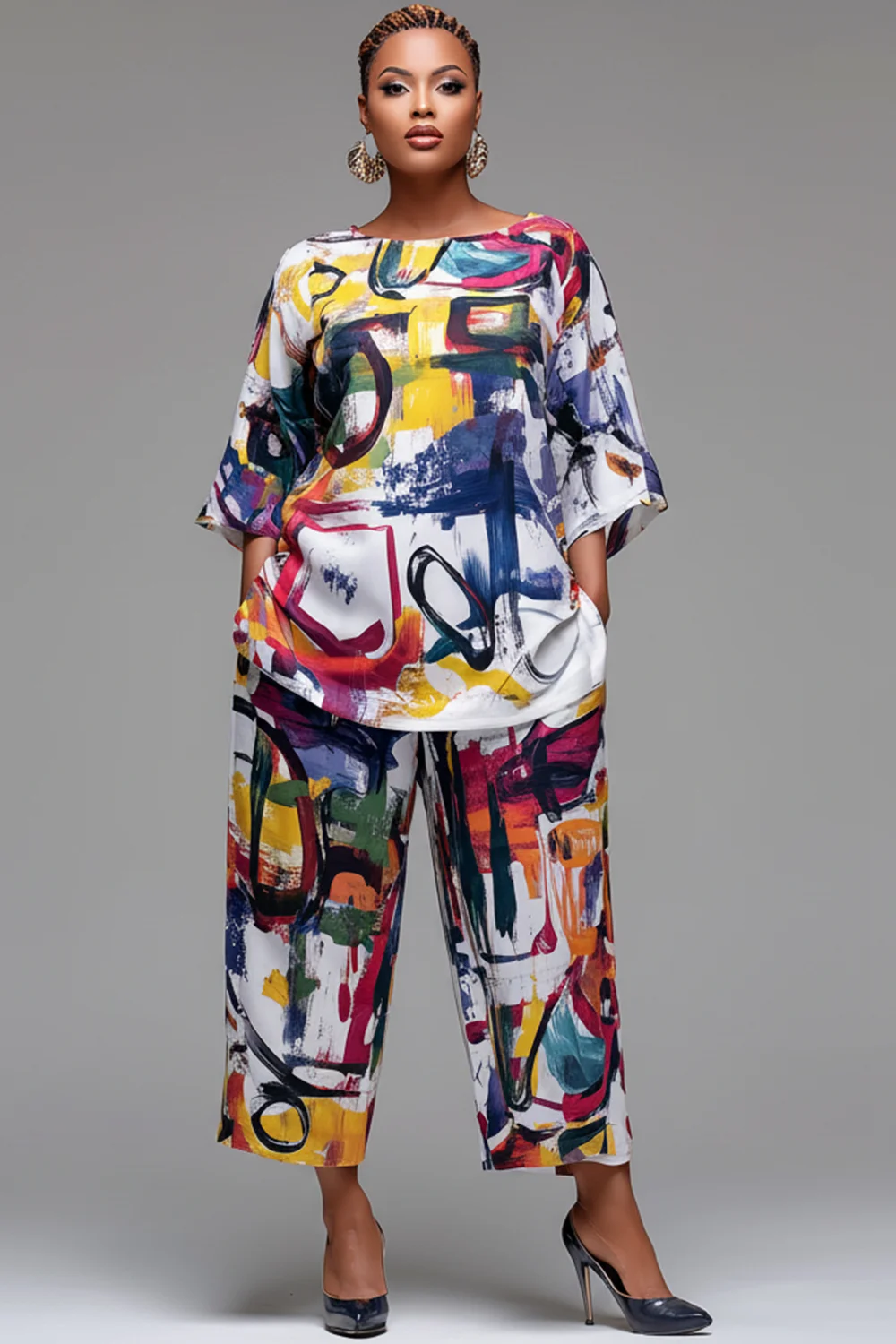 Xpluswear Design Plus Size Vacation Multicolor All Over Print Round Neck Flare 3/4 Sleeve Pocket Two Piece Pant Sets 2024 - Xpluswear