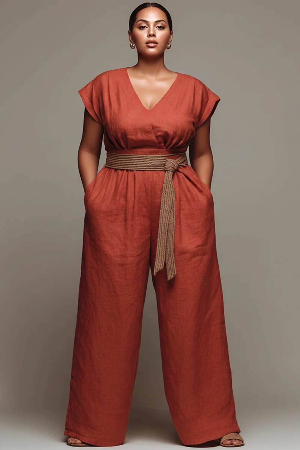 Xpluswear Design Plus Size Vacation Orange V Neck Short Sleeve Pocket Wrap Linen Jumpsuits [Pre-Order] 2024 - Xpluswear