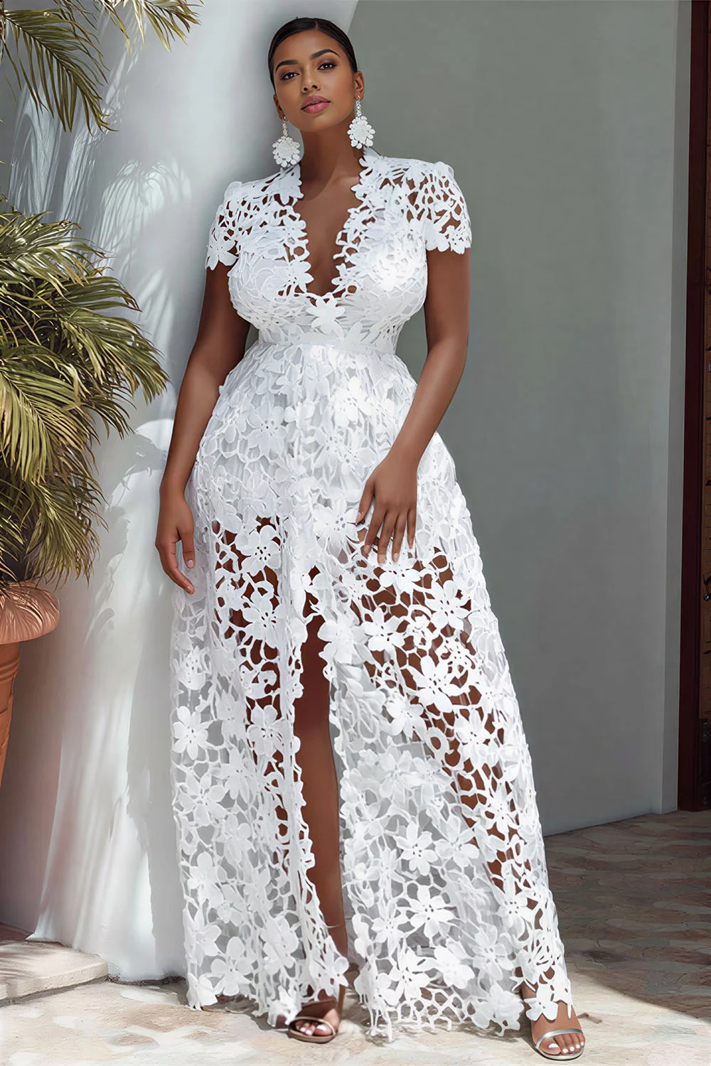 Xpluswear Design Plus Size Vacation White V Neck Short Sleeve Split See Through Maxi Dresses [Pre-Order] 2024 - Xpluswear