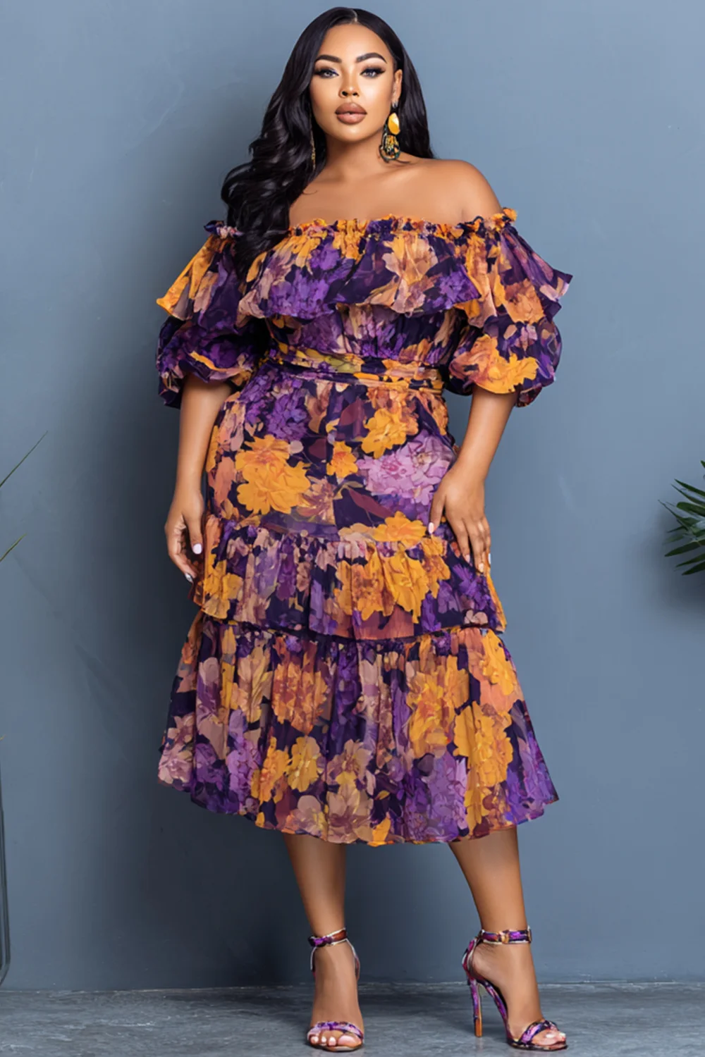 Xpluswear Design Plus Size Wedding Guest Multicolor Floral Off The Shoulder Short Sleeve Ruffle Chiffon Midi Dresses [Pre-Order] 2024 - Xpluswear