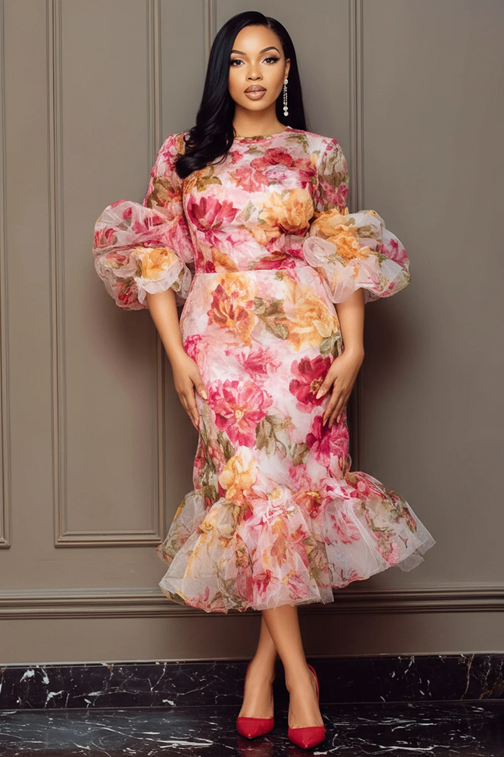 Xpluswear Design Plus Size Wedding Guest Pink Floral Round Neck Flare Half Sleeve Mermaid Ruffle Chiffon Midi Dresses [Pre-Order] 2024 - Xpluswear