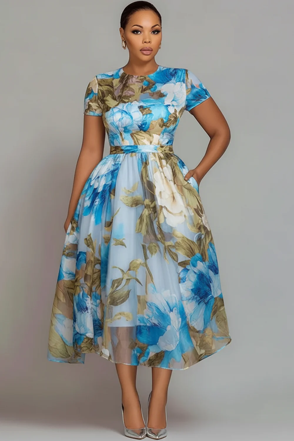 Xpluswear Design Plus Size Wedding Guest Pink Floral Round Neck Short Sleeve Pocket See Through Chiffon Midi Dresses 2024 - Xpluswear