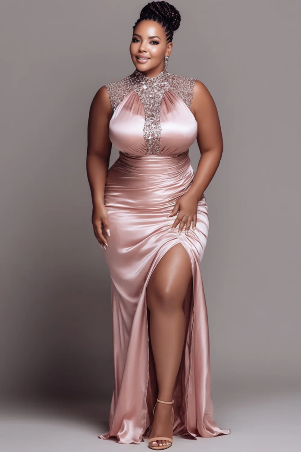 Xpluswear Design Plus Size Wedding Guest Pink Round Neck Split Bodycon Satin Maxi Dresses
